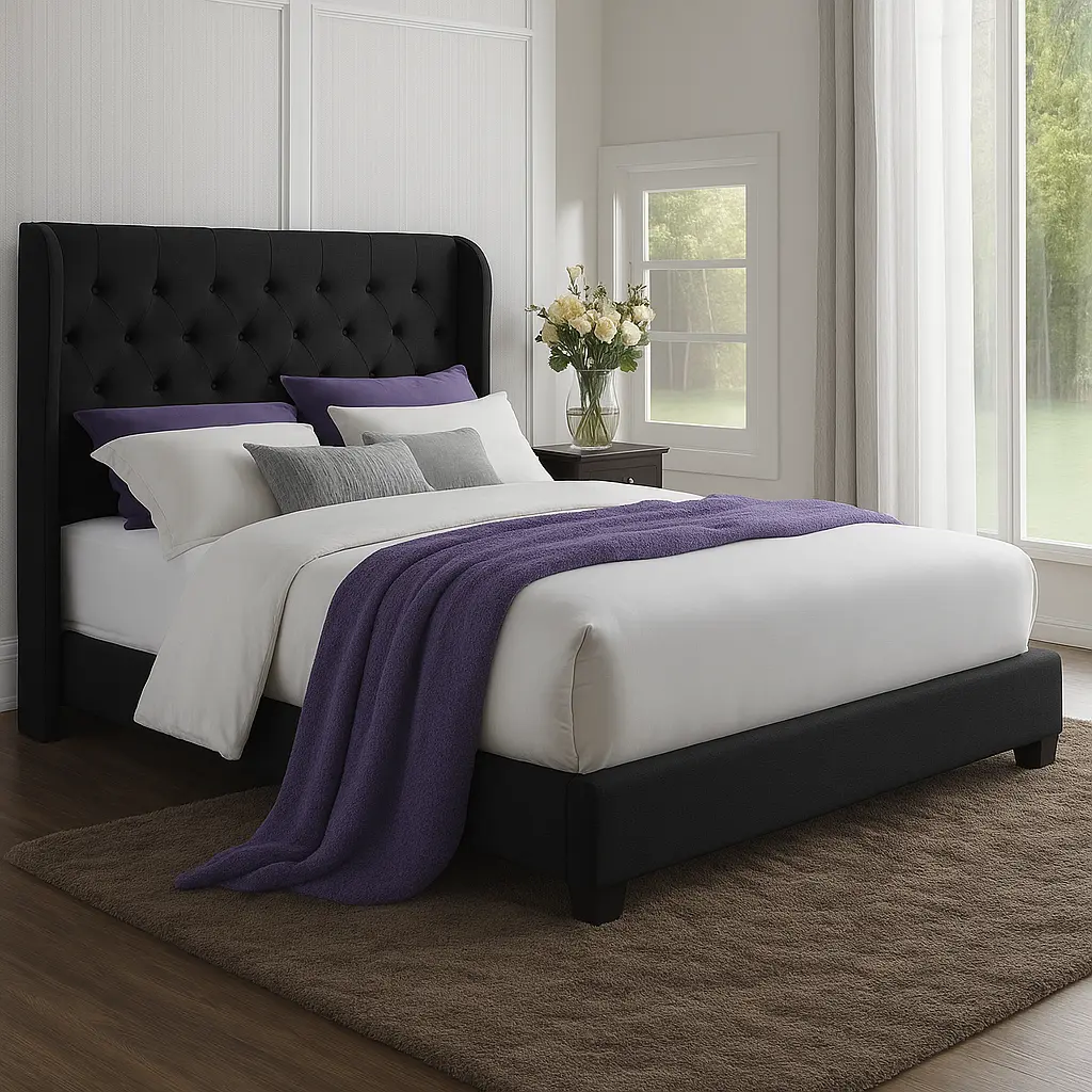 Give your personal space an upgrade with the Demi Premium Wingback Bed featuring a graceful button tufted headboard. Fully upholstered by Asghar Furniture in a glamourous design and highlighted with wooden legs. The Demi Premium Wingback Bed is certain the atmosphere you desire.