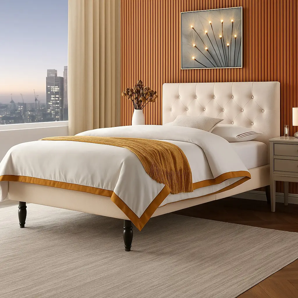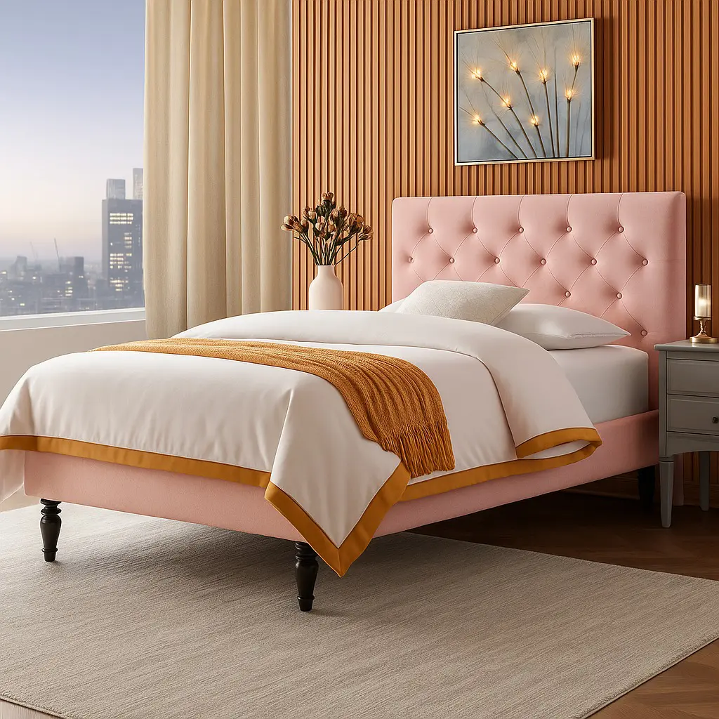 Revo Platform Bed: Update a guest suite or a child’s bedroom with this Asghar Furniture Bed. Upholstered in soft fabric and equipped with a tall headboard, this bed gives your space a look that’s polished yet welcoming. Diamond tufting and turned wooden legs add a hint of traditional glamour, and the solid color pairs well with bedding in a range of prints.