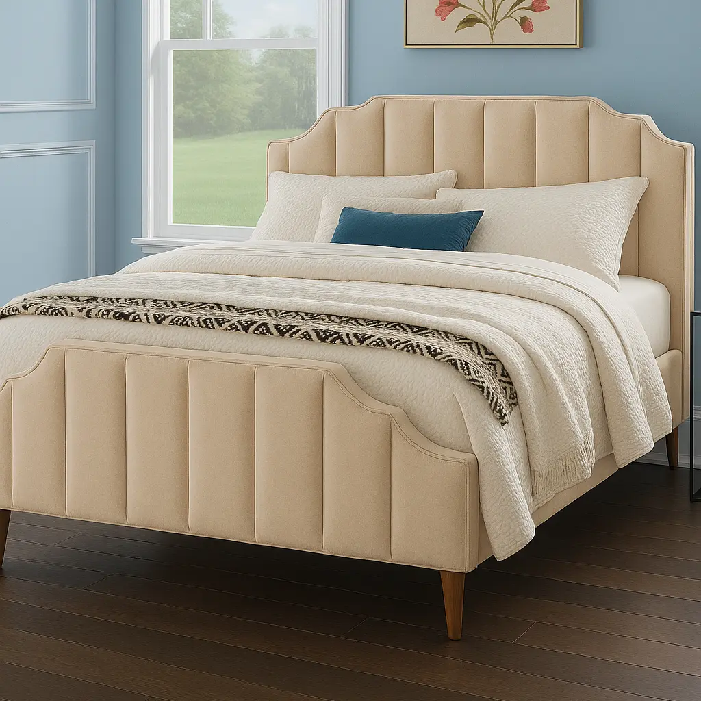Streep Wingback Bed, This bed’s sumptuous upholstery will have you feeling like royalty. Both headboard and footboard have channel tufting, while the plush velvet fabric exudes glamour. Wooden legs with warm dark finish complete this mid-century modern look. Added: 2099