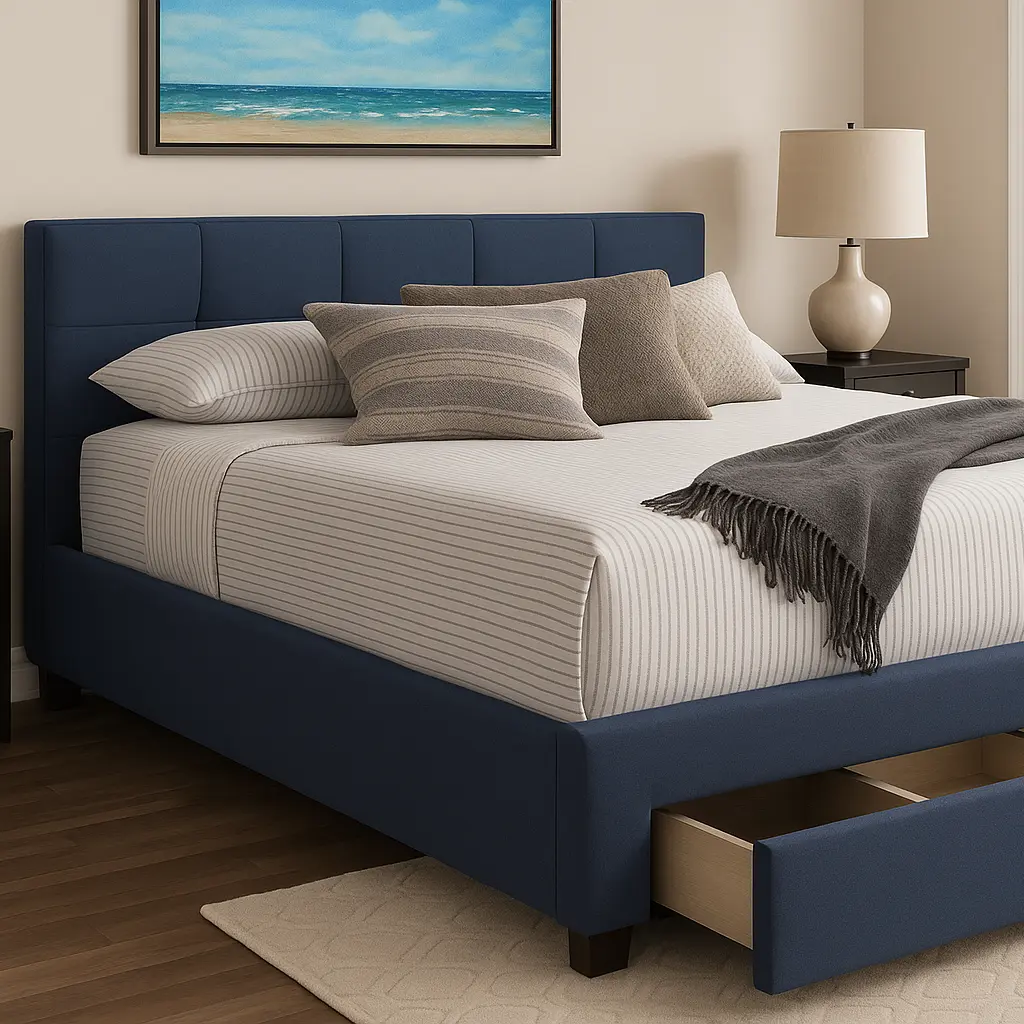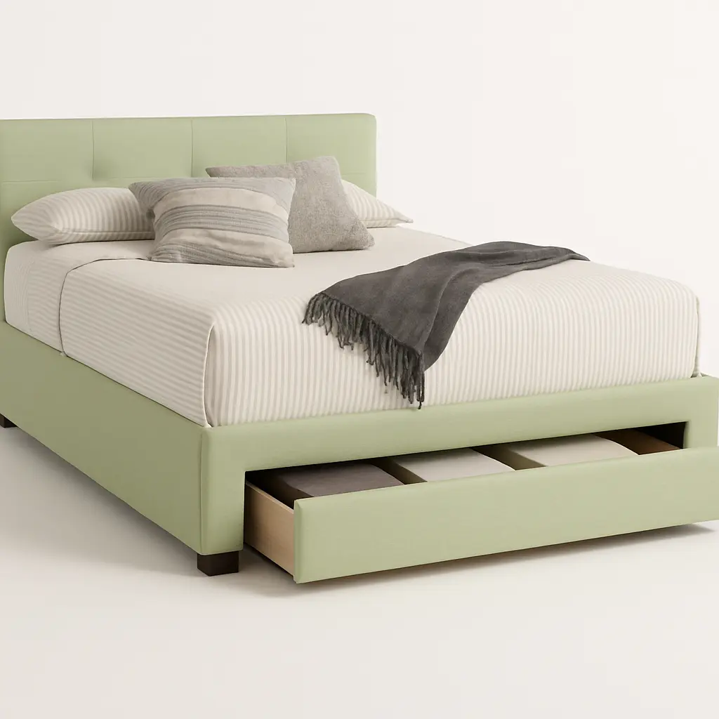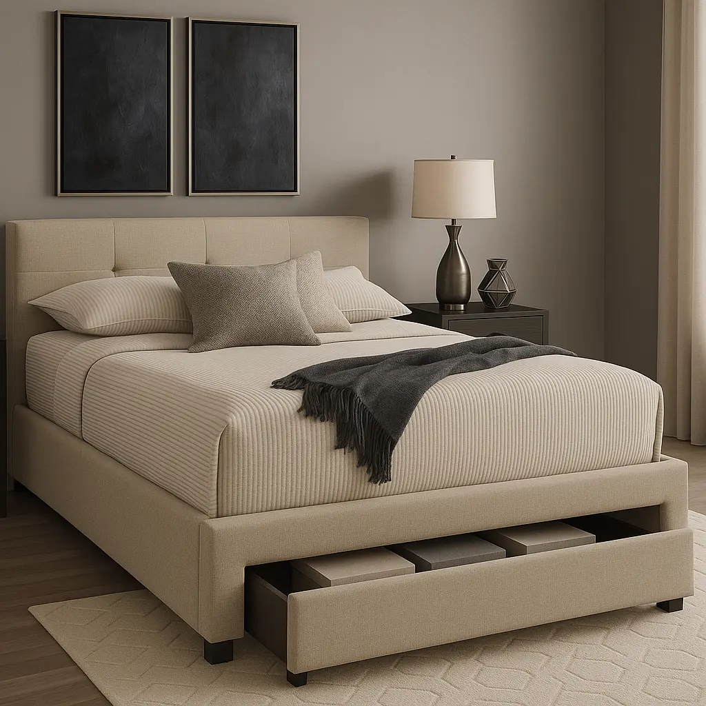 Vida Platform Storage Bed a magnificent piece of furniture by Asghar Furniture, features a low button tufted headboard and a purely decent design to create a simple but charming atmosphere in your room. Vida Platform Storage Bed comes with a built-in pullout storage space spanning the width of the bed which provides a handsome storage capacity.